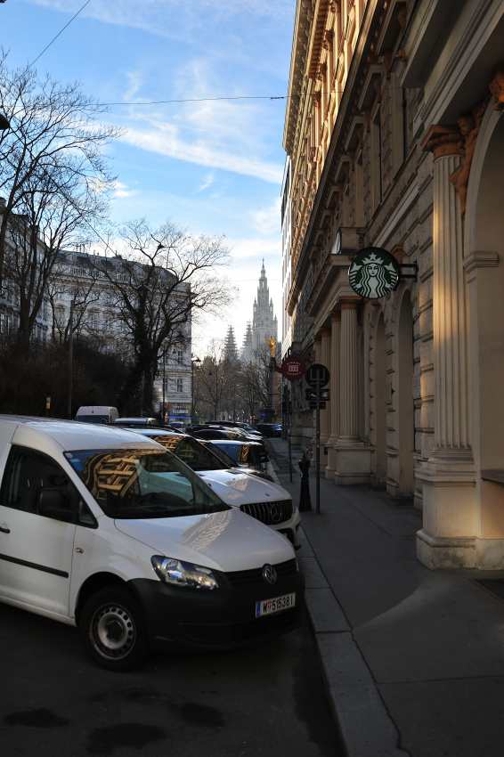 starbucks is everywhere, in the background we see the mayor house of vienna